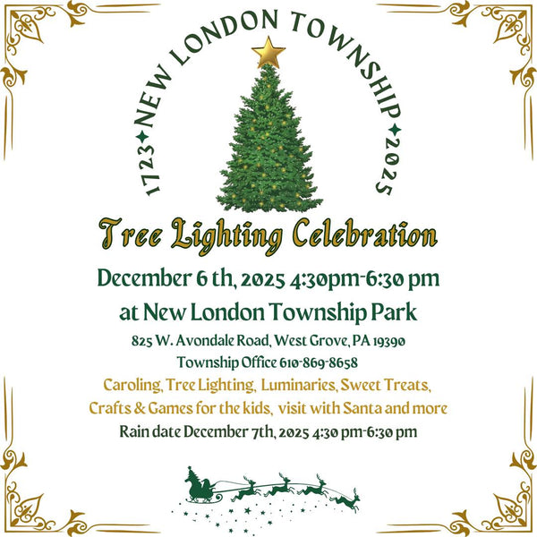 New London Township Tree Lighting Celebration: 4:30-6:30, Saturday, December 6 at New London Township Park, Join the local community in caroling, luminaries, sweet treats, crafts and games for kids, a visit with Santa, and the Christmas tree lighting! The rain date for this event is the following day, Sunday, December 7.