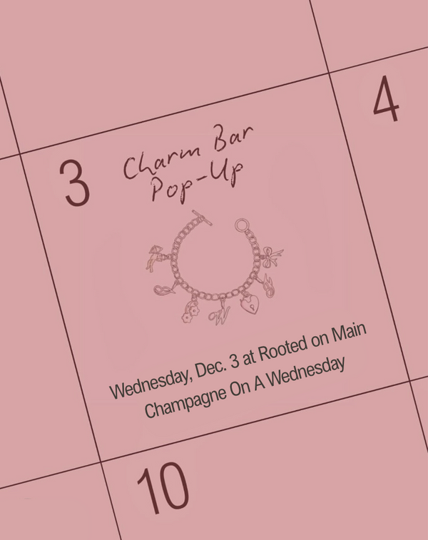 Charm Bar: Wednesday, Dec. 3, 11 AM-2 PM, Rooted on Main, Build your own charm necklace, bracelet or anklet with Champagne On A Wednesday! Choose from a large variety of non-tarnish silver and gold charms to be fitted for a custom piece that is uniquely you!