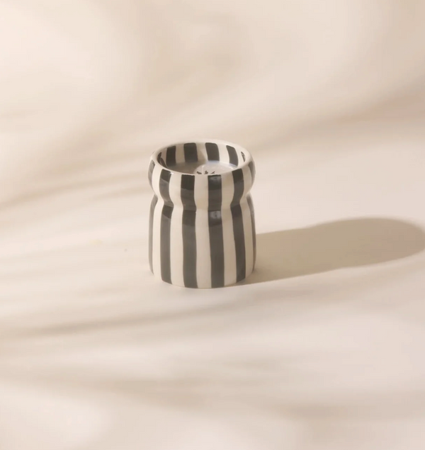 The Cabana collection takes you on a journey to the world's most stunning beaches, with each candle specially crafted to capture the calming aromas of coastal getaways. These striped umbrella-inspired hand painted candles have a distinctive pinched shape and are convenient in size. Once the candle has been used, the food-safe ceramic container can be reused for your own culinary endeavors or as a lovely decorative item.