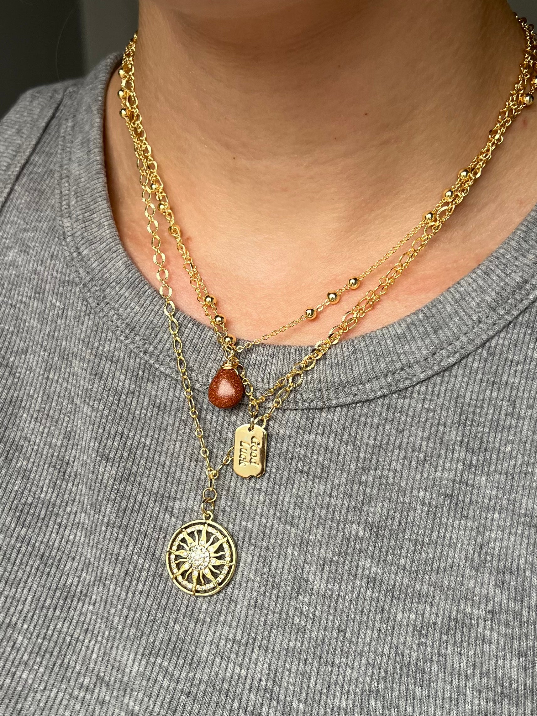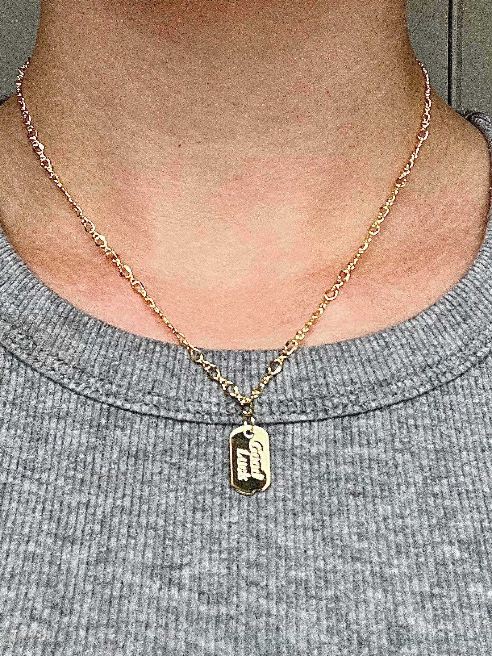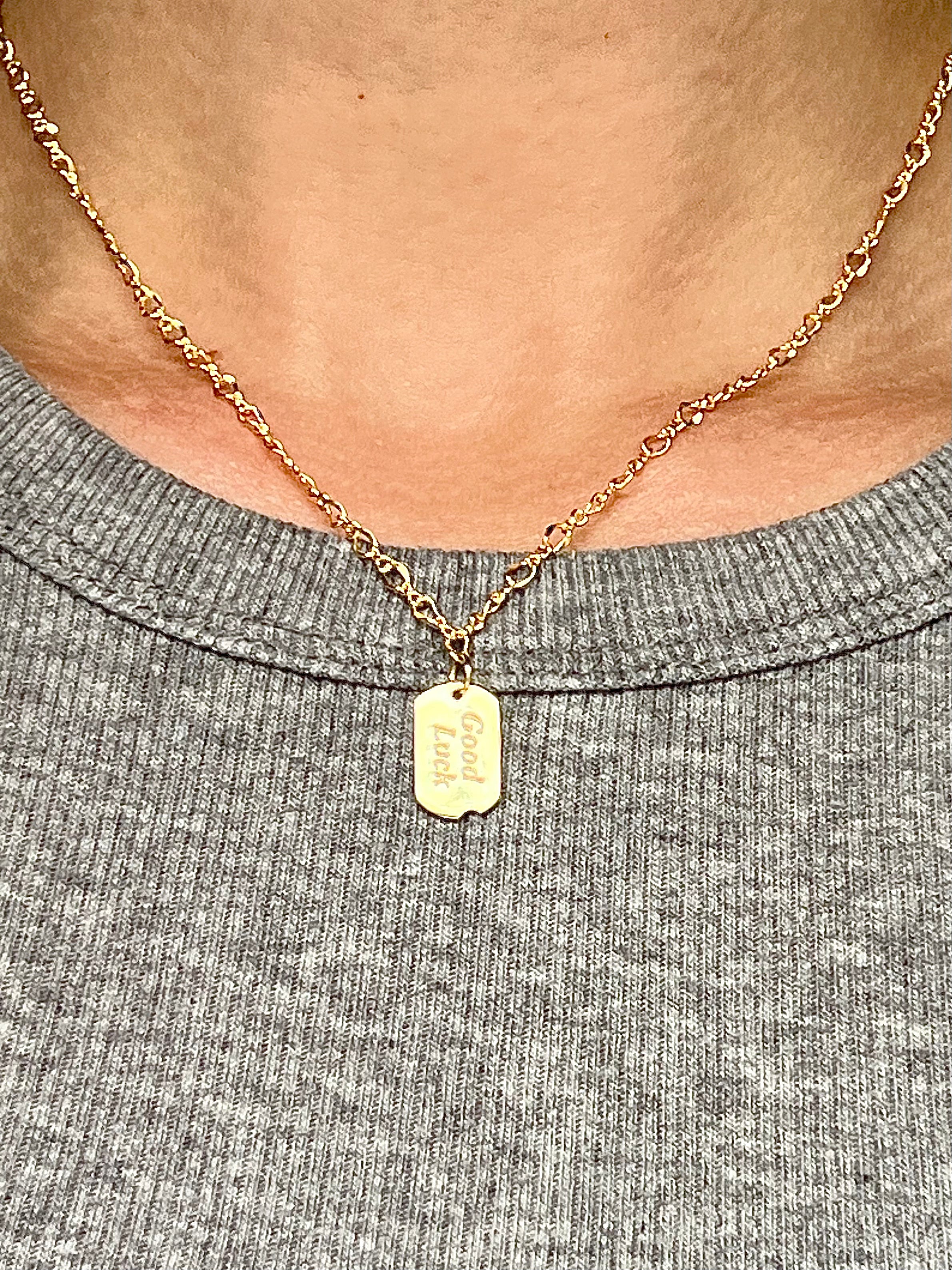 The "Good Luck" Ticket Necklace from Created by Kiera, a small business in Oxford, Pennsylvania, features a gold-plated pennant engraved with "good luck," suspended from a 16" gold chain.