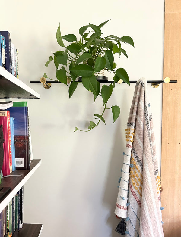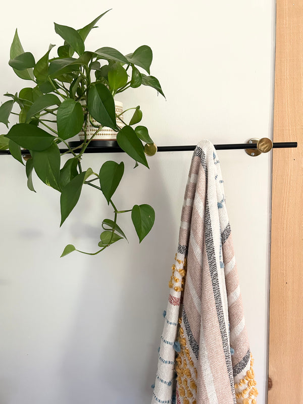 32"W x 7-3/4"D x 2"H Metal Wall Hook w/ 1 Shelf & 5 Hooks, Black & Brass Finish. Minimalist design.
